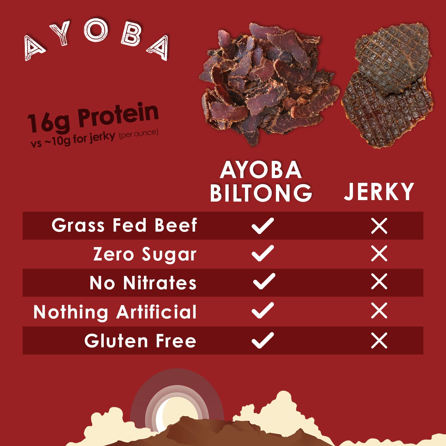 Biltong is a South African recipe beef snack that is crafted with premium cuts of Grass-Fed Beef, marinated, seasoned with only a few natural spices and hung to dry for up to fourteen days! (That's 50x longer than jerky). The result is a tender, easy to chew slice of beef with a naturally beefy flavor.